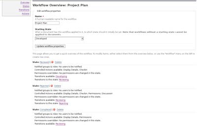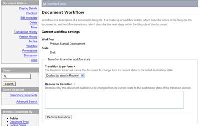 Workflows consist of a network of states and transitions created by administrators and may be triggered on a per folder or Document Type-basis. Workflows manage the permissions on and actions available for a document on a role and or group basis.